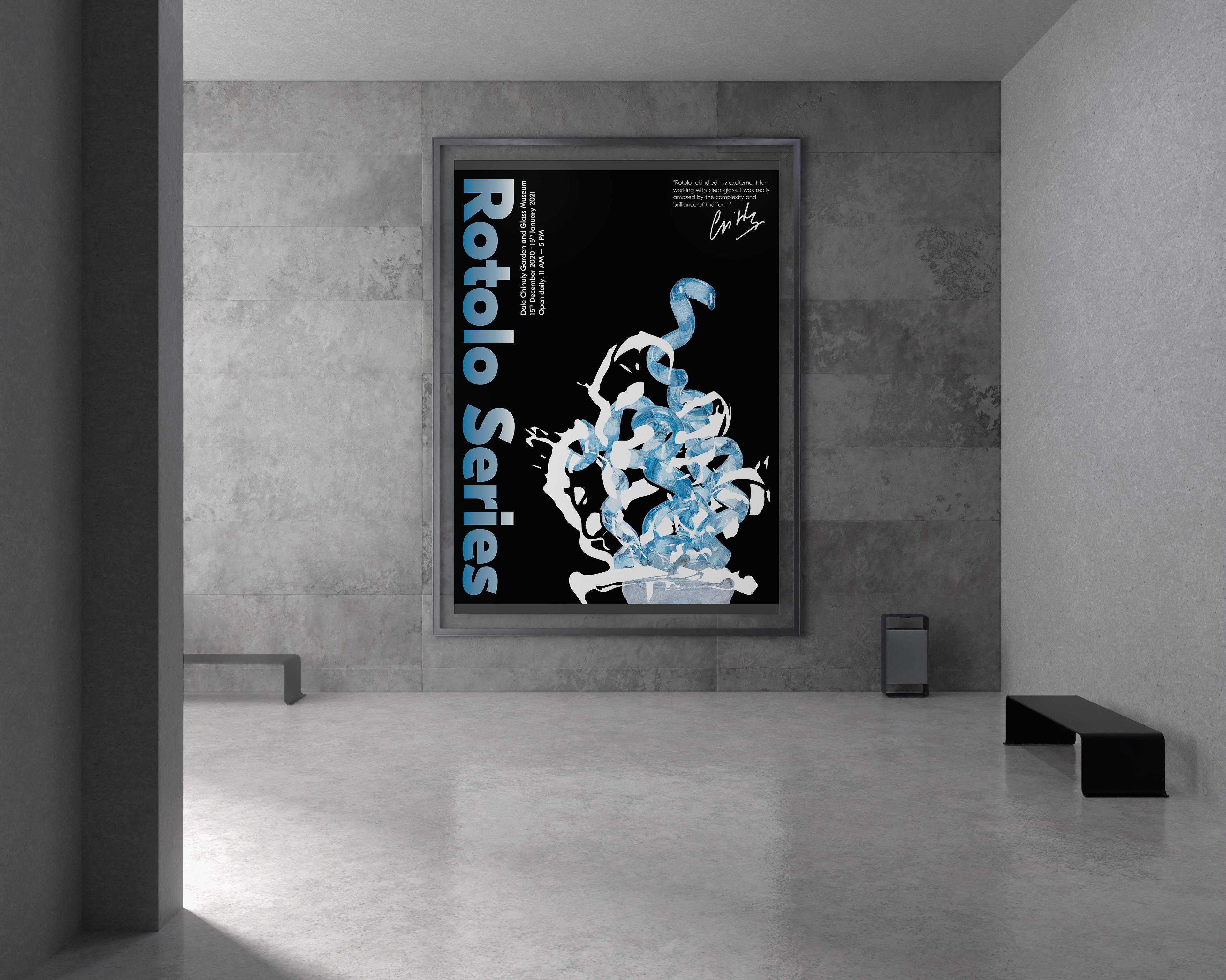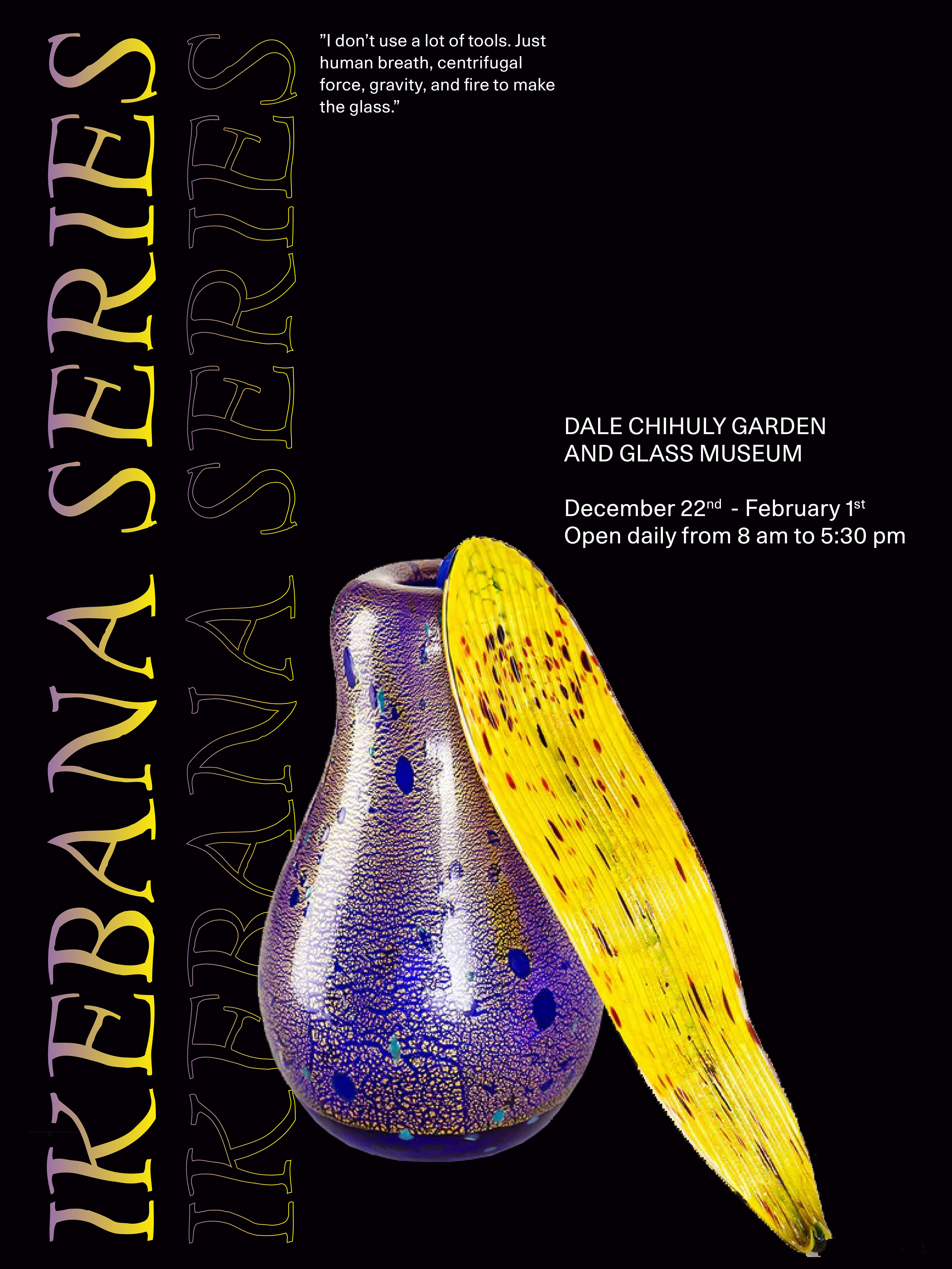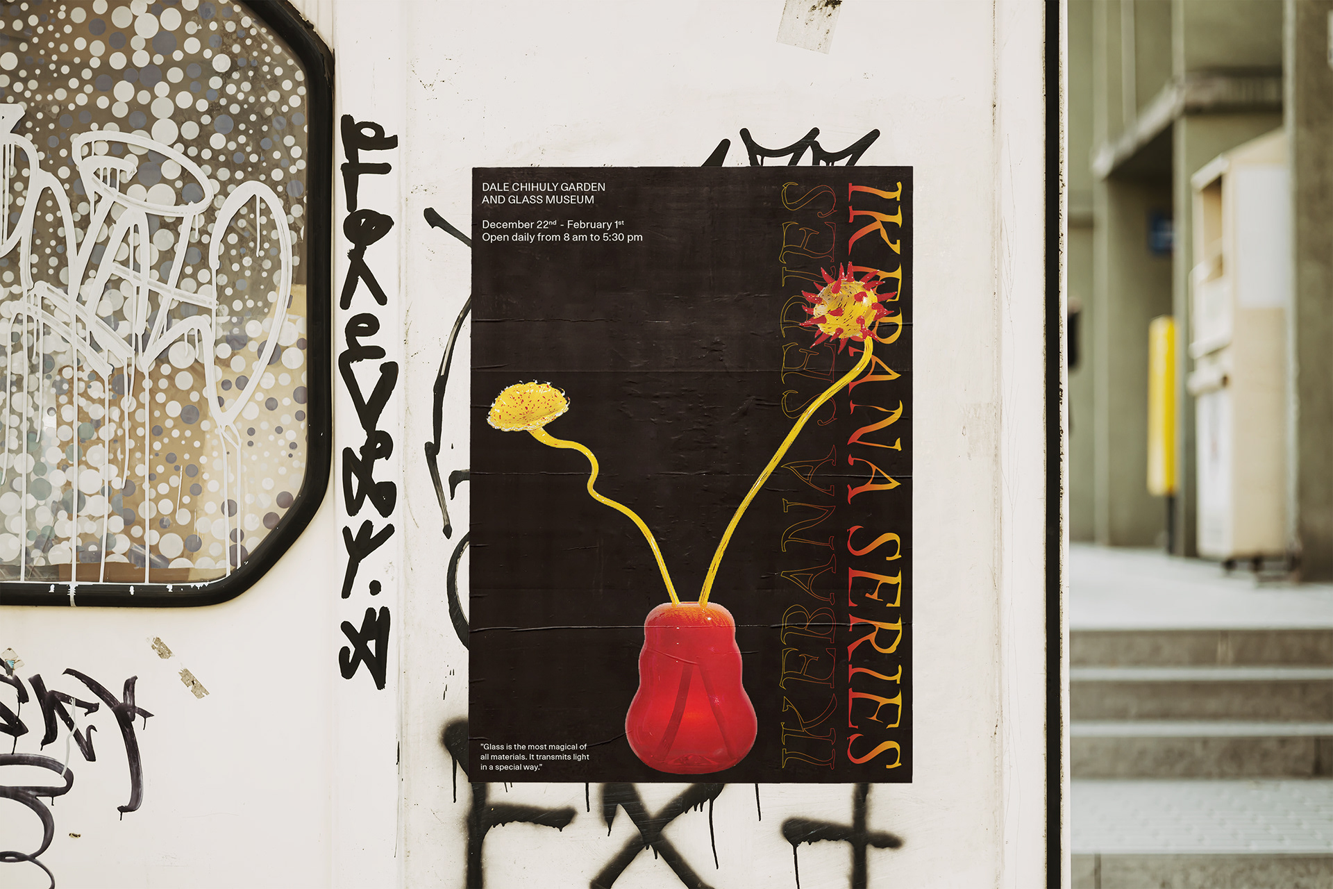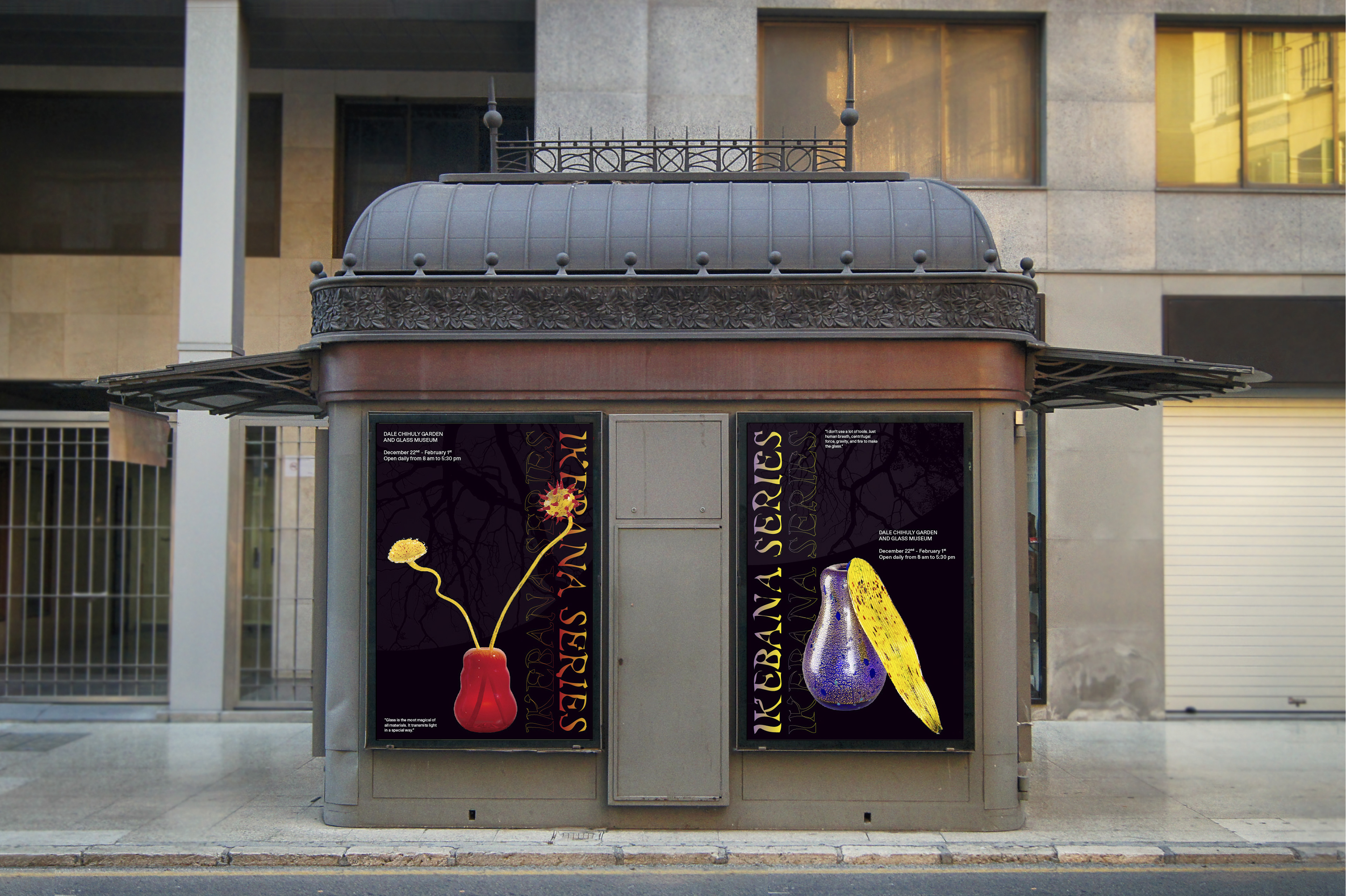 I developed a design system and visuals for an artist's exhibition, focusing on complementing—not overshadowing—his stunning glass sculptures. Color plays a key role in his work, and I aimed to enhance this element.